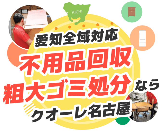 クオーレ名古屋は愛知県で不用品・粗大ゴミの回収を行っております。愛知県、名古屋市では引き取り対象外の粗大ゴミや冷蔵庫などの家電4品目の回収もお任せください。経験豊富なスタッフが愛知県内のご自宅へ伺い回収・処分いたします。